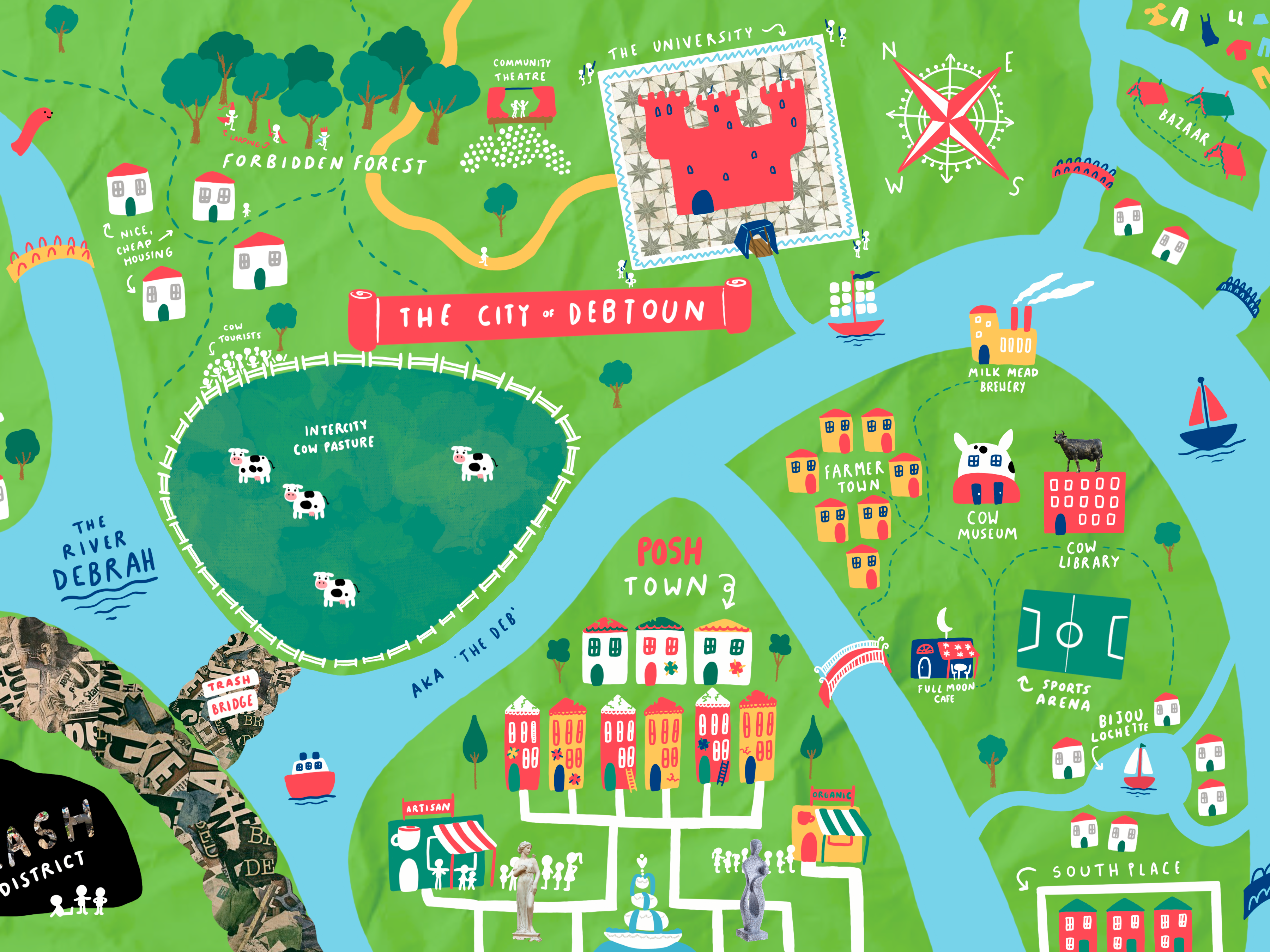 I was commissioned to create a map of the fantastical city of Debtoun for a storytelling event run by Wildcard Stories.